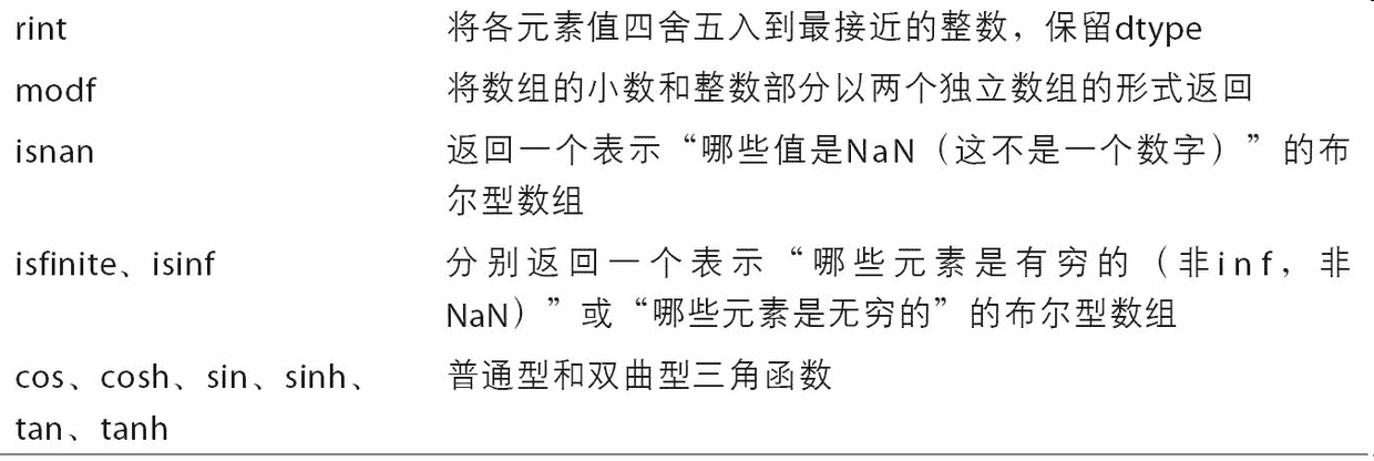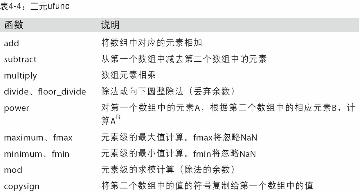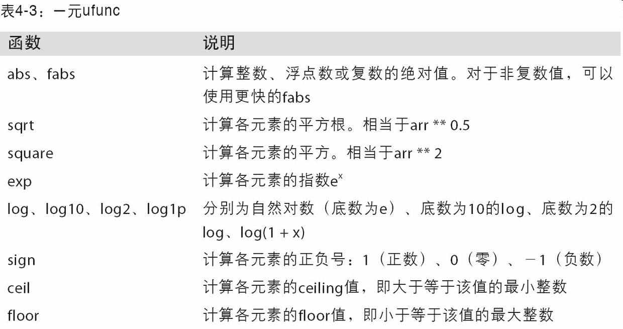 - 用于数据整理和清理、子集构造和过滤、转换等快速的向量化数组运算。