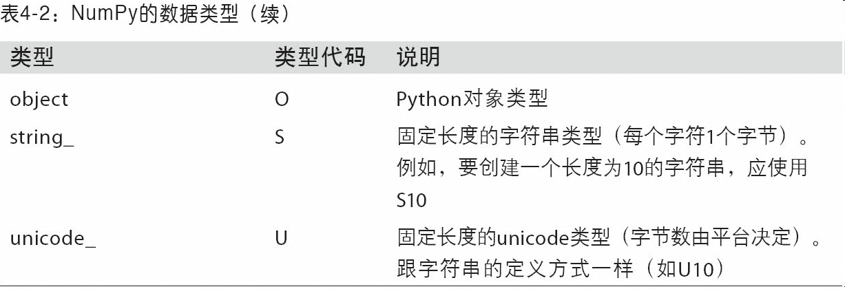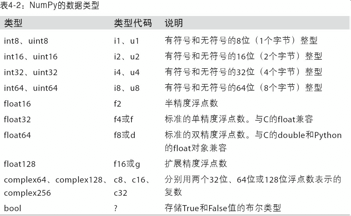除非特别说明(稍后将会详细介绍),np.array会尝试为新建的这个数组推断出一个较为合适的数据类型。数据类型保存在一个特殊的dtype对象中。比如说,在上面的两个例子中,我们有: