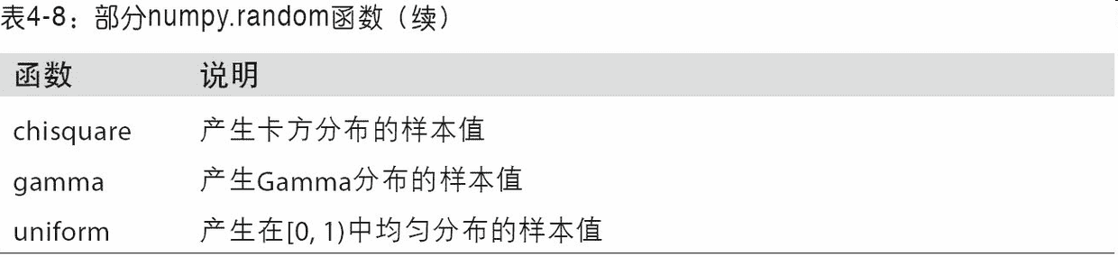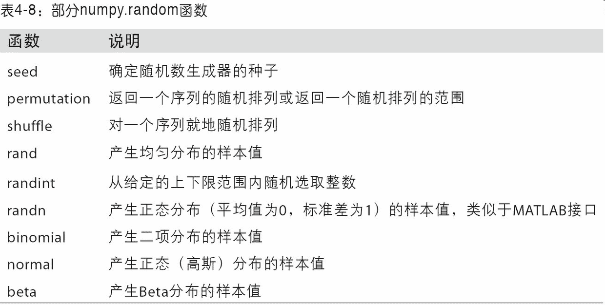 表 4-8 列出了numpy.random中的部分函数。在下一节中,我将给出一些利用这些函数一次性生成大量样本值的范例。